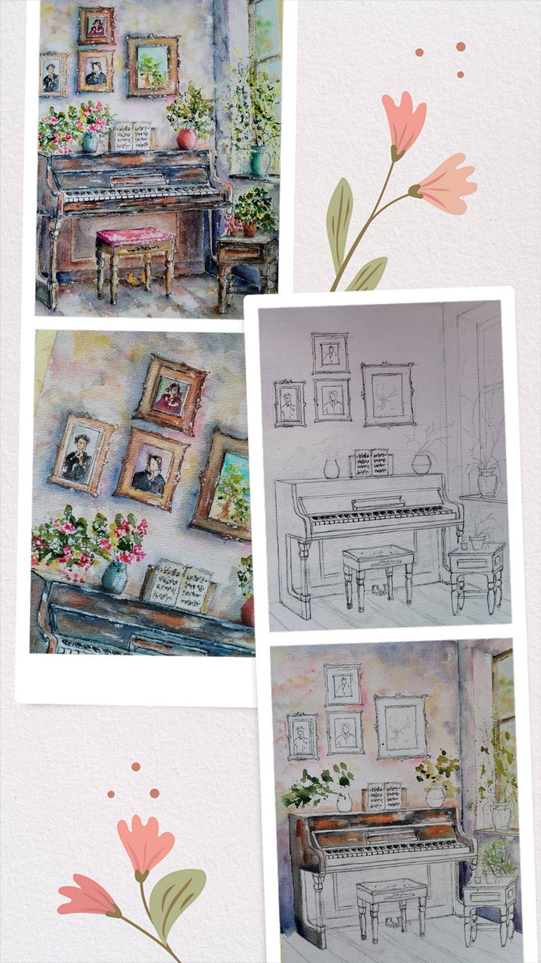 A papíron minden réteg önálló életet kezd élni: a színek áttetszően siklanak egymásba, majd lassan testet adnak a házaknak, ablakoknak, régi emlékeknek. Ez az én saját játékom a festékkel és a vízzel