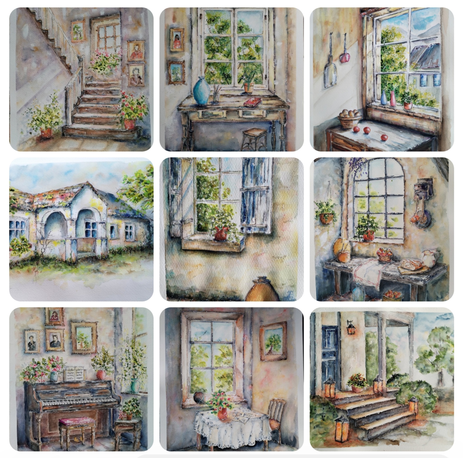 (Unique expressive watercolor paintings – houses, windows, and stories preserved in color.)